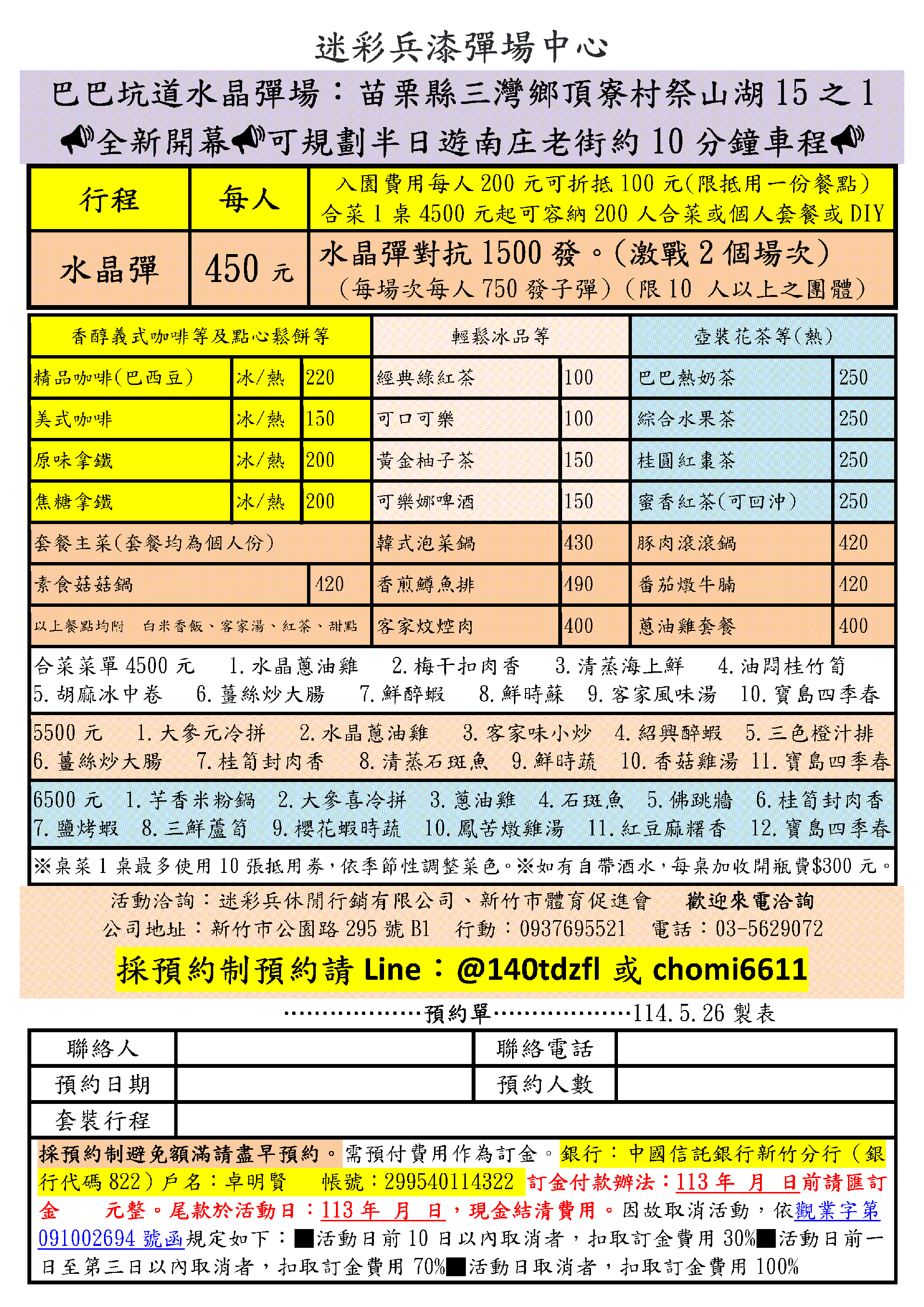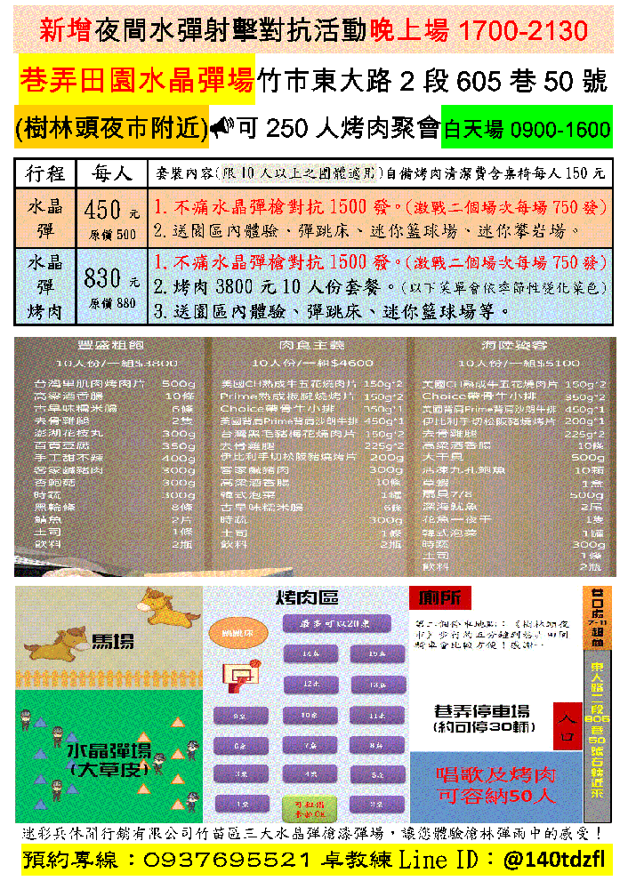 獨家經營桃竹苗精選旅遊景點運動休閒觀光最佳選擇團體服飾衣帽T恤批發、表演服務、音響帳篷佈置租賃,本公司服務項目:特約公司再享9折優惠。迷彩兵休閒行銷擁有崎頂新樂園漆彈場、南十八漆彈場、老頭擺農庄漆彈場、神農溫泉漆彈場等四大場地,為新竹地區最大型與安全之漆彈場地體驗活動。